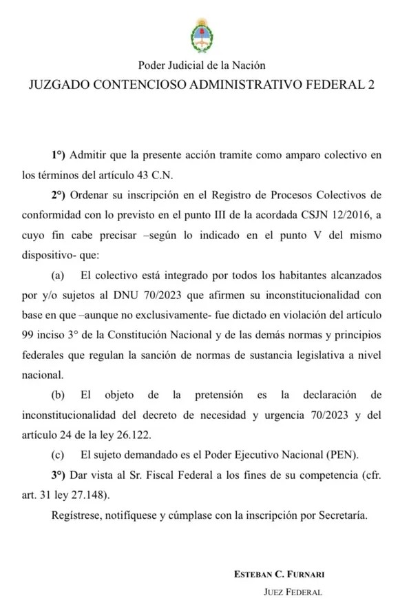 «Admitir que la presente acción tramite como amparo colectivo en los términos del artículo 43 de la Constitución Nacional», reza el primer artículo del registro judicial dado a conocer por el tribunal a cargo de Furnari.
