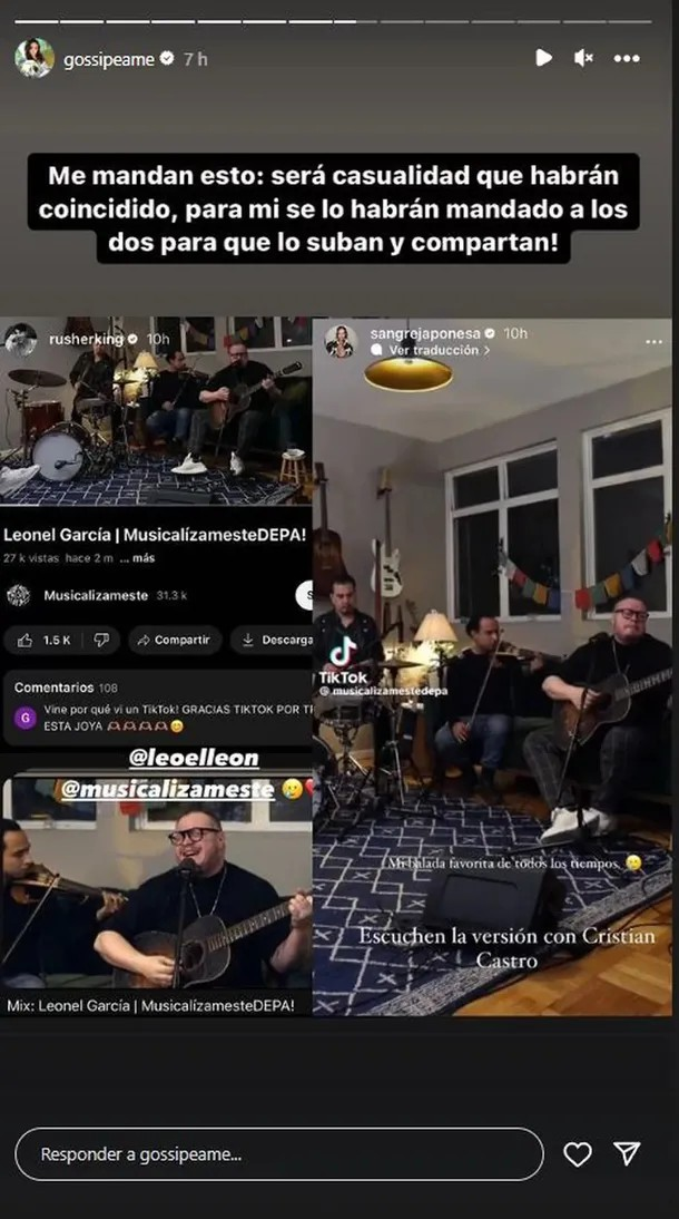Fue la cuenta de Instagram «Lo más Popu» quien compartió en sus redes sociales la coincidencia entre las historias de la China Suárez y la de Rusherking. Los artistas compartieron la misma canción con minutos de diferencia. Se trata de un tema de Leonel García, cantautor vocalista de Sin Bandera, quien se presentó en un íntimo.
